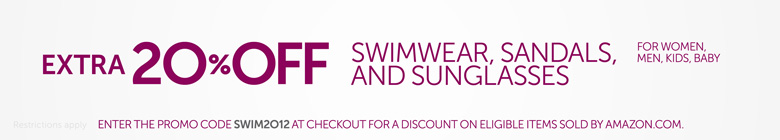 Amazon is offering Extra 20% off swimwear, sandals and sunglesses with code SWIM2012. Items must be sold by amazon.com.
