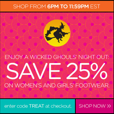 Ghouls Night Out Sale!  Save 25% on Girl's and Women's styles with code TREAT for 6 hours starting tonight at 6:00PM EST and ending at 11:59PM EST only at Crocs.com!