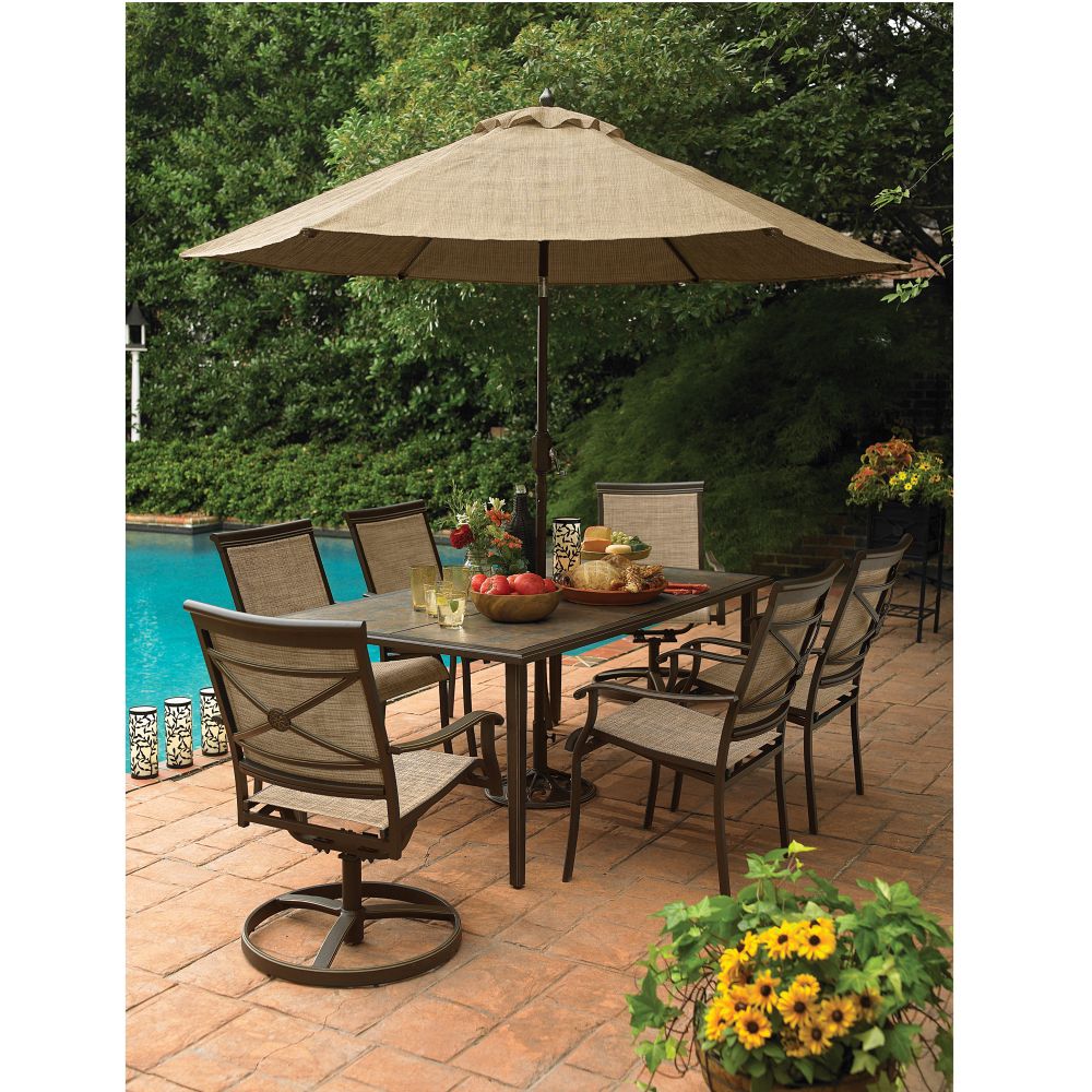 Sears has this Country Living Ashmore 7-Piece Dining Set for $394.99 after $5 coupon code SEARS2011.  The set includes four sling dining chairs, two sling swivel rockers, and one tile top dining table. (The umbrella is not included.)  Shipping is free.  (Expires 06/18/11)