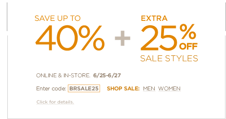 Banana Republic is offering up to 40% off + extra 25% off already-reduced items with promo code: BRSALE25. Ends 6/27